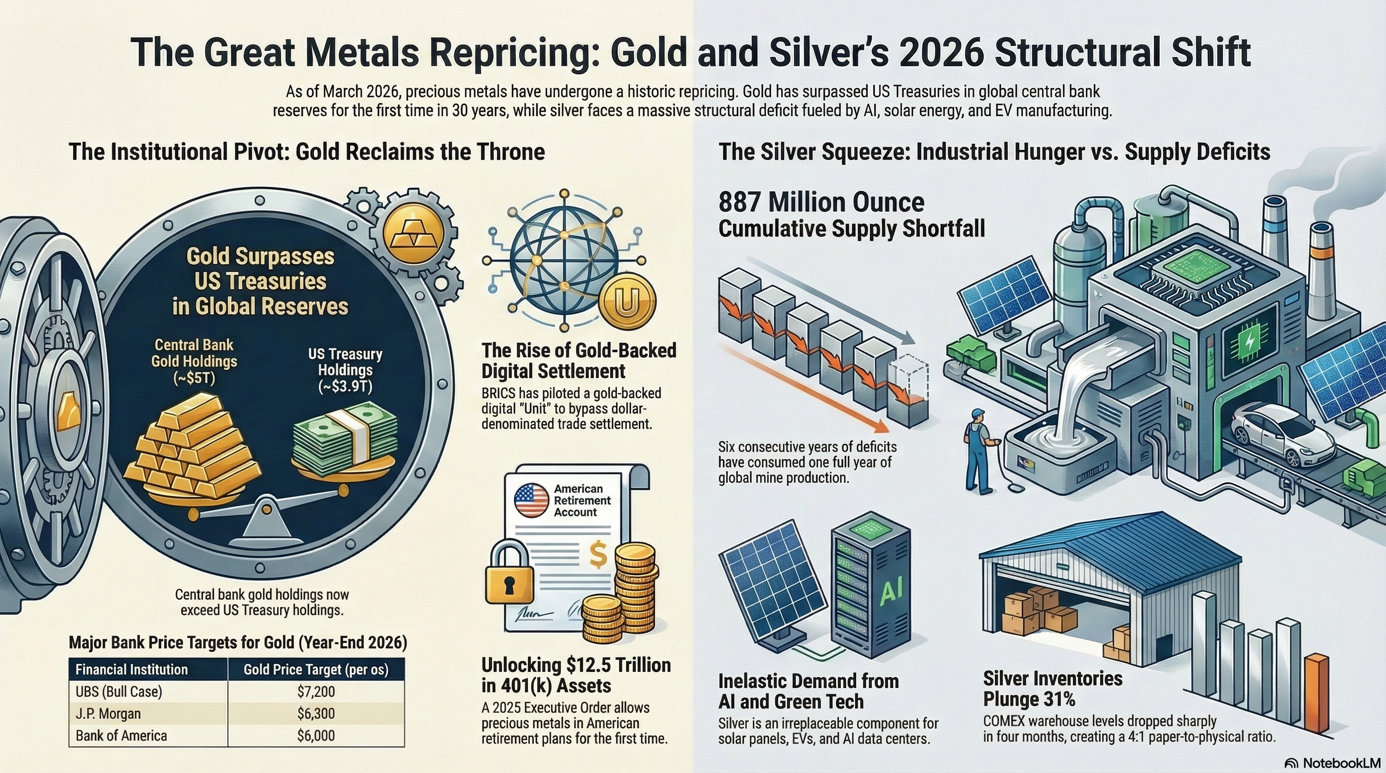 Die Institutionen, die buchstäblich die weltweite Geldmenge verwalten, sind gemeinsam zu dem Schluss gekommen, dass ein physisches Metall, das aus dem Boden gewonnen wird, ein vertrauenswürdigerer Wertspeicher ist als die Anleihen der weltweit größten Volkswirtschaft. Gold notiert am 18. März bei knapp 4.906 USD/Unze, was einem Anstieg von rund 73 % gegenüber dem Vorjahr entspricht. Silber wird bei rund 77 USD/Unze gehandelt, was einem Anstieg von 128 % im gleichen Zeitraum entspricht, und verzeichnet das sechste Jahr in Folge ein Angebotsdefizit.