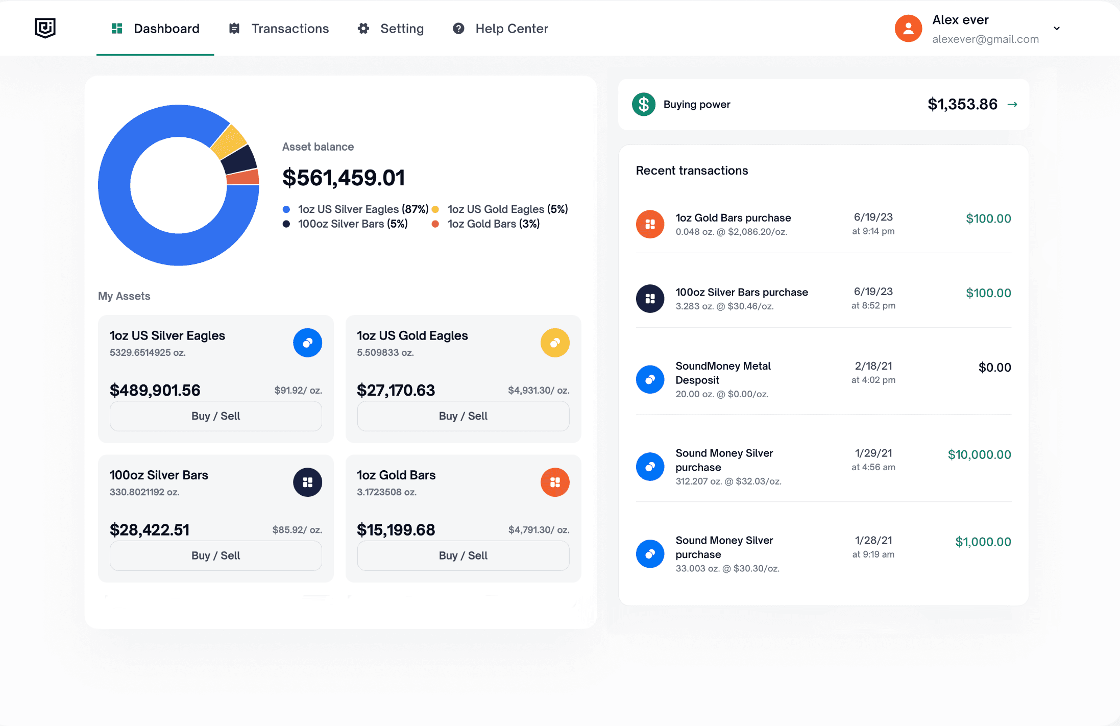 Verwandeln Sie Ihr tägliches Geld in echten Reichtum, auf den Sie sich verlassen können. Kaufen, halten und verkaufen Sie echtes physisches Metall, das in sicheren Tresoren aufbewahrt wird, mit transparenten Preisen, sofortiger Auszahlung auf Ihr Bankkonto und Lieferung, wann immer Sie es wünschen.